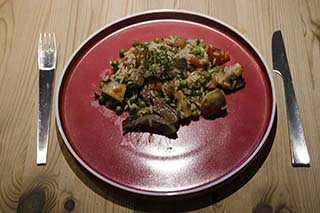 Möhren mit Salz, Pfeffer und Essig abschmecken. Alles anrichten, mit Kernen bestreuen und garnieren. Evtl. Bratensatz mit etwas Wasser lösen und über das Fleisch träufeln.